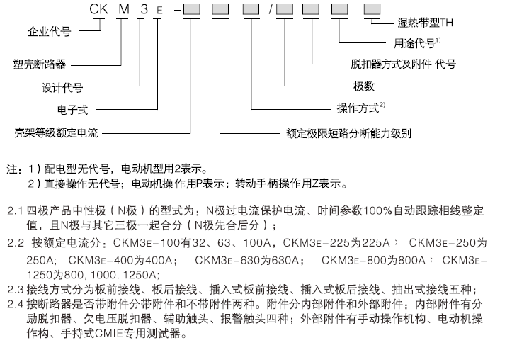CKM3E系列电子式塑壳断路器 { 以下简称断路器 ), 是本公司采用先进的 CAD/CAM/GAE 设 计、制造技术 ,研制 、开发的新型断路器之一 。其额定绝缘电压为800v ,适用于交流50Hz ,额 定工作电压至 690V ,额定电流至 1250A的电路中作不频繁转换及电动机不频繁起动之用 。断路 器具有过载长延时反时限 、短路短延时反时限 、短路短延时定时限 、短路瞬时和欠电压保护功 能 ,能保护线路和电源设备不受损坏 。